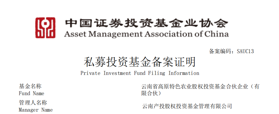 云南省高原特色农业高质量发展基金正式注册并完成备案