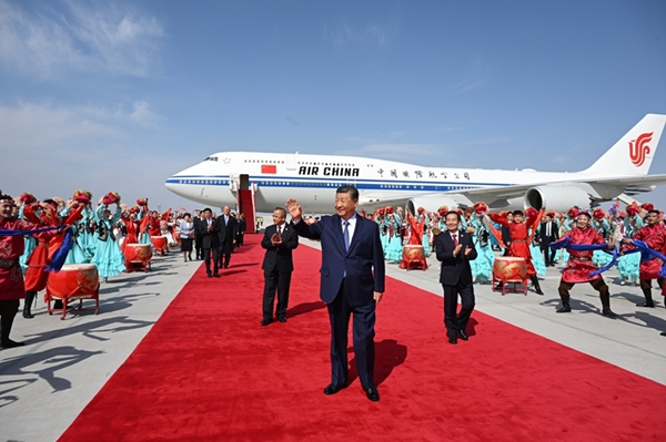 14时20分许,习近平乘坐的专机在天山国际机场降落,等候在停机坪的新疆各族各界群众热烈欢呼。习近平走出舱门,向欢迎群众挥手致意。