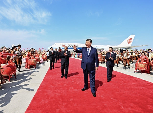新疆维吾尔自治区党委书记陈小江、自治区人民政府主席艾尔肯·吐尼亚孜、自治区人大常委会主任祖木热提·吾布力、自治区政协主席努尔兰·阿不都满金、新疆生产建设兵团政委何忠友等在舷梯下迎候。习近平走下舷梯时,少先队员献上鲜花。各族群众代表身着民族服饰,载歌载舞,欢迎总书记的到来,表达对总书记的衷心祝福。