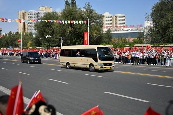 9月23日下午,中共中央总书记、国家主席、中央军委主席习近平率中央代表团乘专机抵达乌鲁木齐,出席新疆维吾尔自治区成立70周年庆祝活动。这是从机场到住地途中,习近平向沿途欢迎的群众挥手致意。新华社记者 辛悦卫 摄