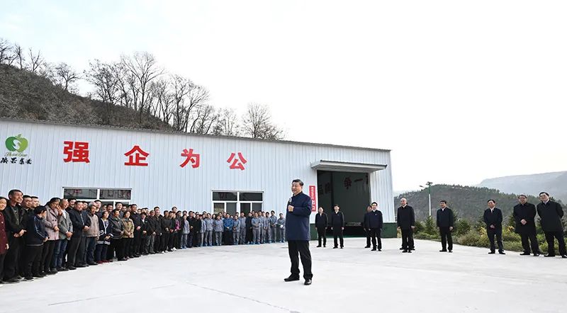 车间外,老乡们聚集在一起,高声向总书记问好。习近平同老乡们拉起家常,回忆当年他在陕北的知青岁月。习近平对老乡们说,我在陕北生活了7年,当年看到老乡们生活很艰苦,心里就想着怎么样让大家生活好起来。这次来延安,看到一派硕果累累的丰收景象,交通条件大为改善,发生了翻天覆地的变化。过去陕北老乡们修梯田、种庄稼,面朝黄土背朝天,抡起老锄头干活,广种薄收,十分辛苦,如今山坡上退耕还林种上了苹果,老乡们有工作、有稳定收入,孩子有好的教育,老人都有医保,生活越来越好。从陕北的变化就可以看到中国的变化。习近平指出,现在,“两个一百年”奋斗目标的第一个百年目标已经实现,绝对贫困问题解决了,老乡们过上了好日子,但还要继续努力往前走,让生活越来越美好。陕北的气候、光照、纬度、海拔等非常适宜发展苹果种植,加上滴灌技术、矮化种植技术、选果生产线等不断发展,就地卖出,销路不愁,大力发展苹果种植业可谓天时地利人和,这是最好的、最合适的产业,大有前途。习近平强调,中国共产党是人民的党,是为人民服务的党,共产党当家就是要为老百姓办事,把老百姓的事情办好。空谈误国,实干兴邦。要认真学习贯彻党的二十大精神,全面推进乡村振兴,把富民政策一项一项落实好,加快推进农业农村现代化,让老乡们生活越来越红火。老乡们爆发出雷鸣般的掌声。
