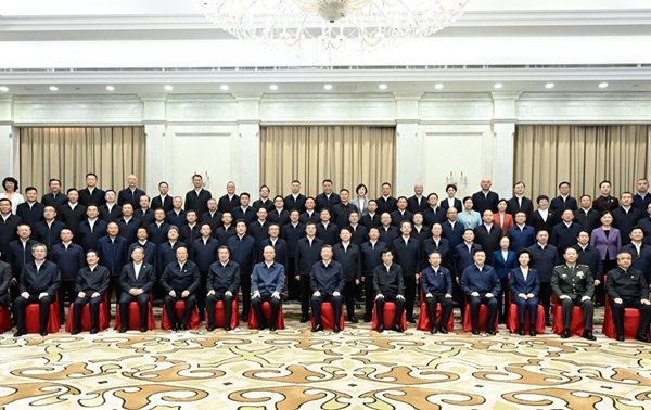 习近平等来到接见现场时,全场响起长时间热烈掌声。习近平向大家挥手致意,不时同代表亲切交流,并同大家合影留念。